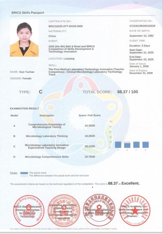 近日,必威西汉姆联官网首页教师在2025“一带一路”暨金砖国家技能发展与技术创新大赛中获金砖技能护照认证,成为我校医学技术领域首批获此国际认证的教师,为学校职教出海增添重要资质支撑。