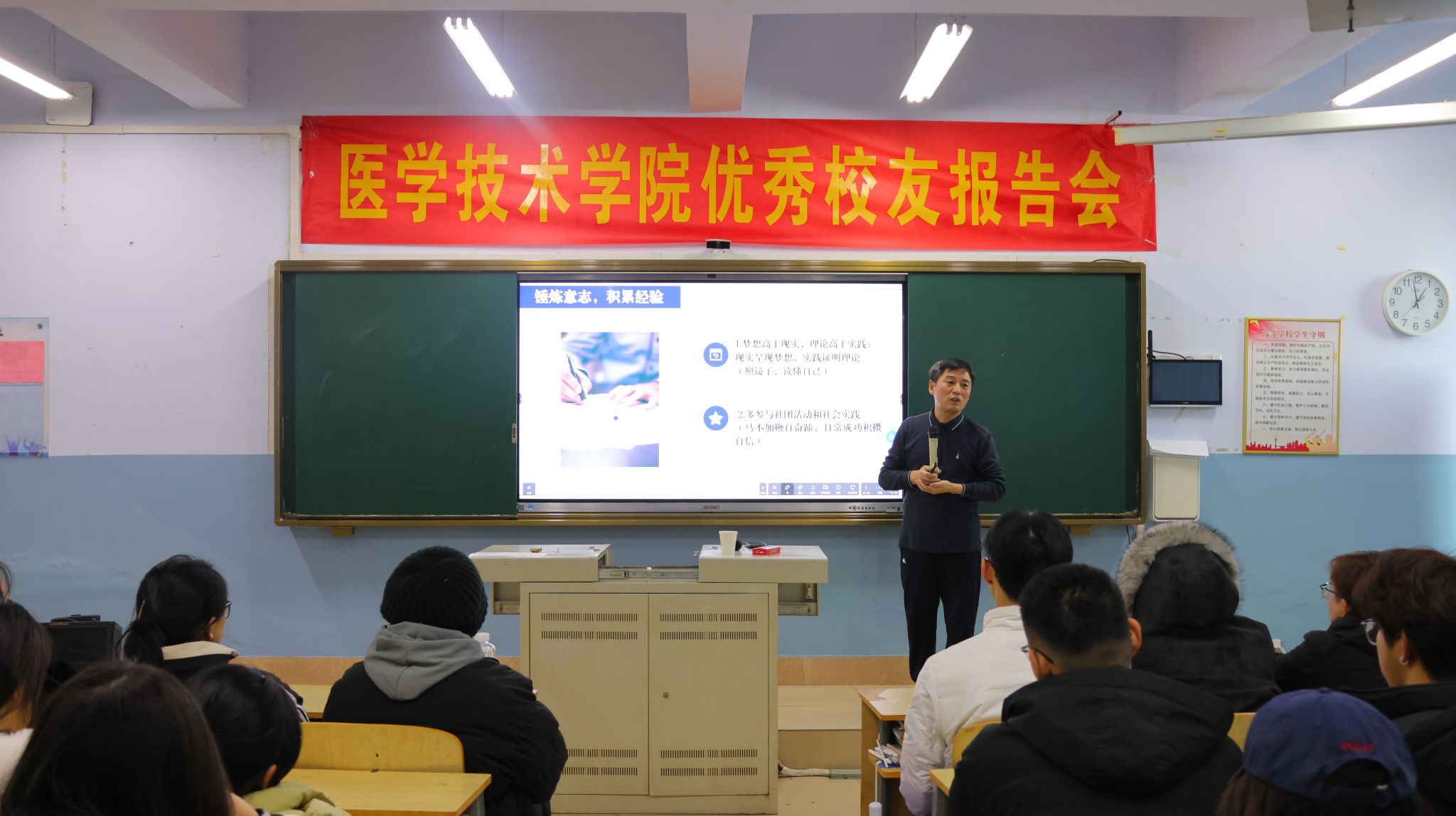 报告会上,张丙国围绕“锤炼意志积累经验”“尝试创业跬步致远”“解决就业担当责任”三个方面,详细阐述了创业的初心、准备过程与发展阶段。从初入医药行业积累经验,到创办医疗机构,再到转型投身教育培训,他以自身跨越多领域的创业历程为鲜活案例,生动诠释了多听、多看、多思、敏行的创业理念。他勉励同学们主动把握时代机遇,树立创业意识,以创新思维带动就业实践,实现个人价值与社会贡献的统一。