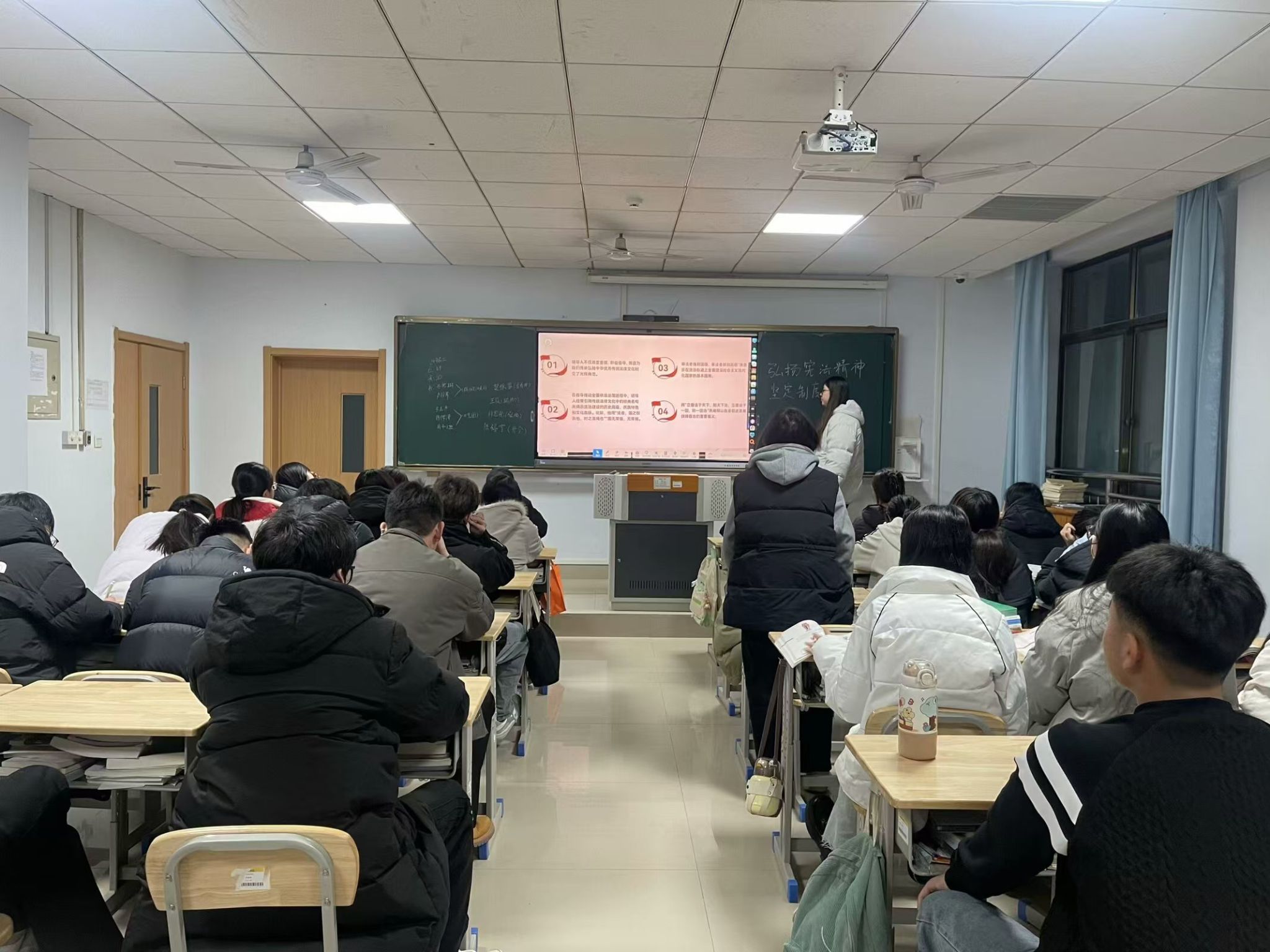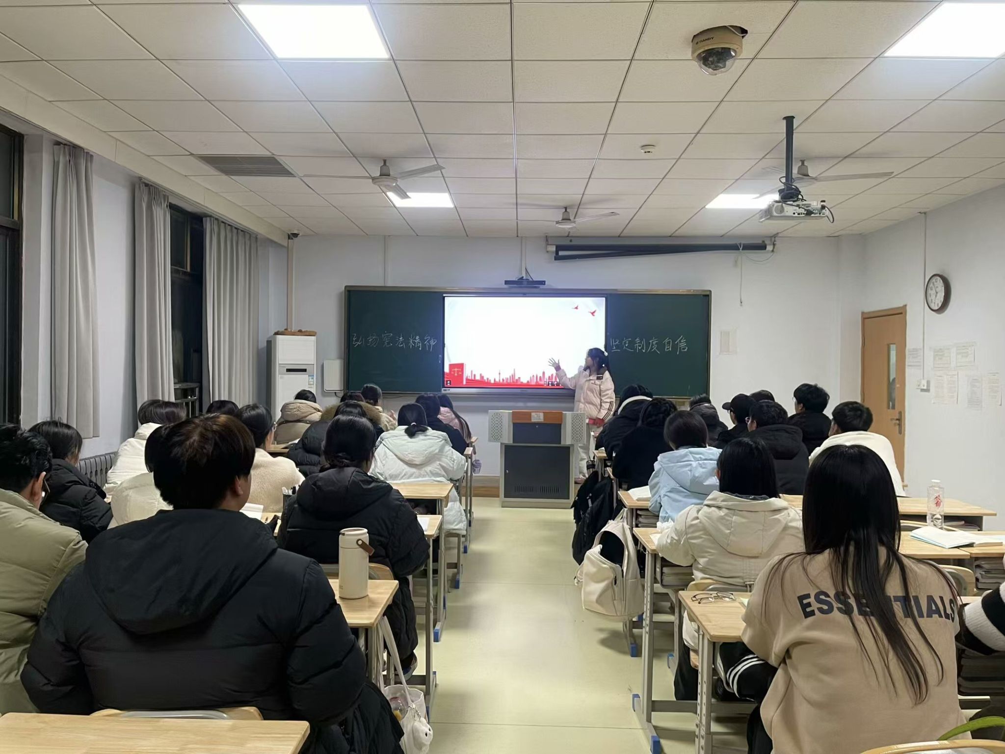 各班辅导员老师以主题班会的形式,从宪法的概念、宪法的性质以及宪法实施的意义等方面对宪法知识进行详细地介绍和讲解,以加强同学们对宪法的认识。班会中强调了宪法具有最高的法律效力,是普通法律立法的最高原则,普通法律不得和宪法相抵触,让学生切实感受到了宪法的重要性。班会过程中组织“宪法知识问答”活动,通过提问和抢答的方式,检验学生对宪法知识的掌握情况,进而提高同学们的宪法知识水平。