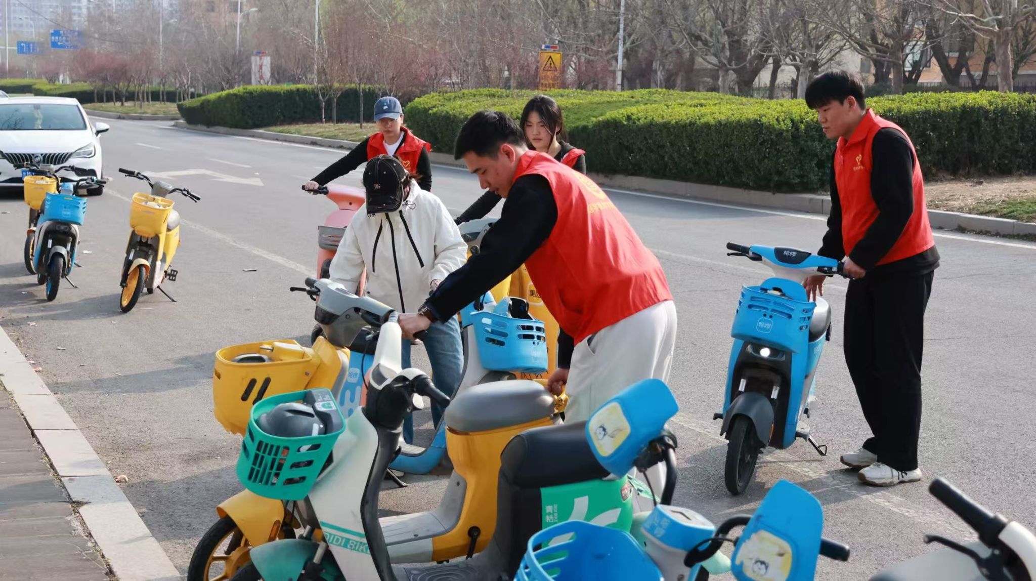 本次活动紧扣党建引领核心主线,立足学生干部队伍建设与育人工作实际,设置文明志愿服务、“永恒的雷锋”主题文化展参观研学两大核心板块。志愿服务环节,学院聚焦公共环境整治与文明建设,组织学生干部志愿者开展共享电动车规范整理专项服务。带队教师向全体志愿者明晰任务分工,着重强调户外志愿服务安全规范,阐明维护公共秩序是践行雷锋精神的具象实践,号召全体志愿者以务实作风彰显担当,在全员步调一致的节奏下,校园南门周边乱停乱放的共享电动车被规整至指定停放区域,同时队伍细致清理车辆缝隙、车筐及停车片区内的垃圾杂物,切实为师生营造了安全、文明、有序的出行环境。